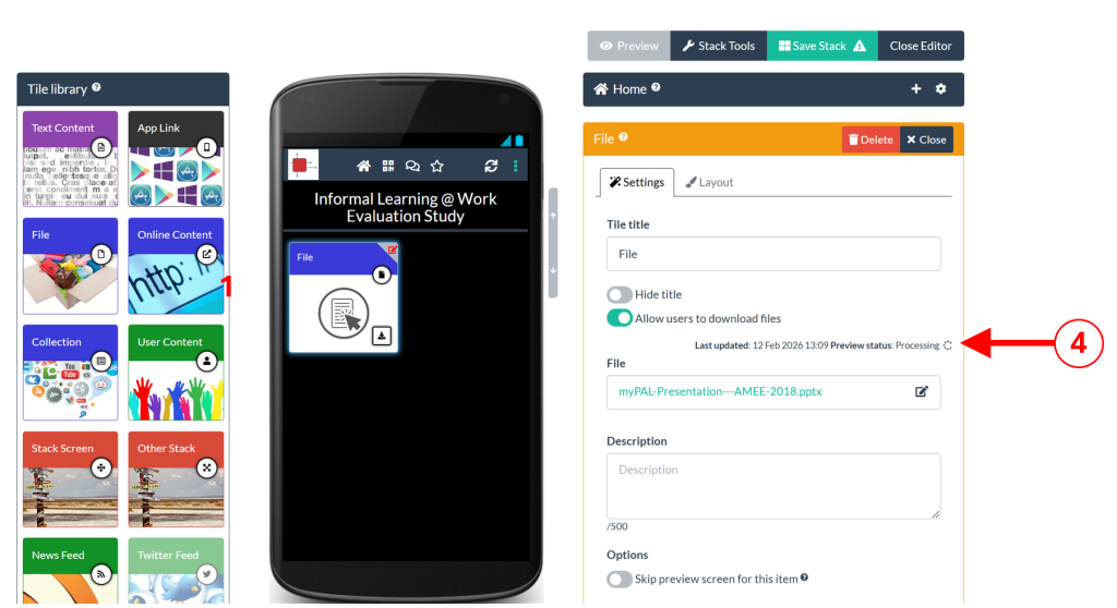 Your initial stack will then be created using the template and you will be taken to the editor. In the centre of this screen you will see a mobile view of your stack (3) containing the tiles (content) from your conference template. On the right you will see the general stack settings area (4) where you can add the summary information about your stack. On the left is the Tile Library (5) which you can use later to add extra tiles/content to your stack.