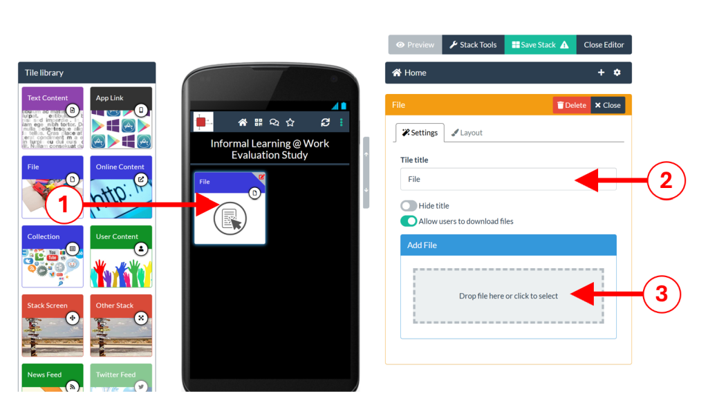 Drag and drop a File Tile from the Tile Library into your stack (1). In the Settings tab, give your tile a title (2) and then click in the Add File box (3) and choose the file to add from your computer.