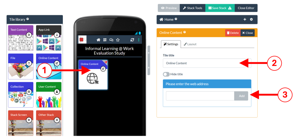 Drag and drop an Online Content Tile from the Tile Library into your stack (1). In the Settings tab, give your tile a title (2) and and then type (or paste in) the link to the webpage you want to use and click Add (3).