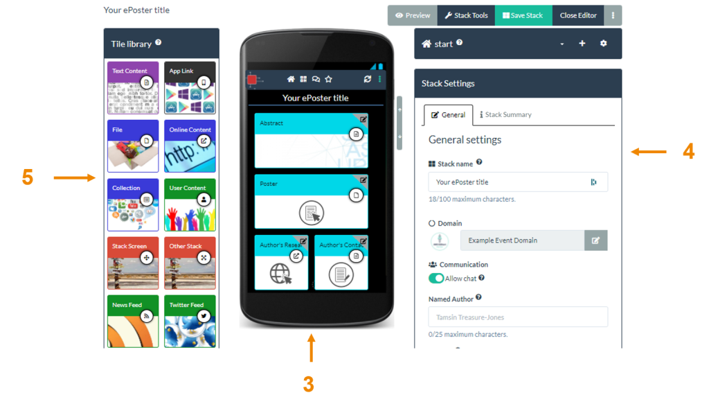 Your initial stack will then be created using the template and you will be taken to the editor. In the centre of this screen you will see a mobile view of your stack (3) containing the tiles (content) from your conference template. On the right you will see the general stack settings area (4) where you can add the summary information about your stack. On the left is the Tile Library (5) which you can use later to add extra tiles/content to your stack.