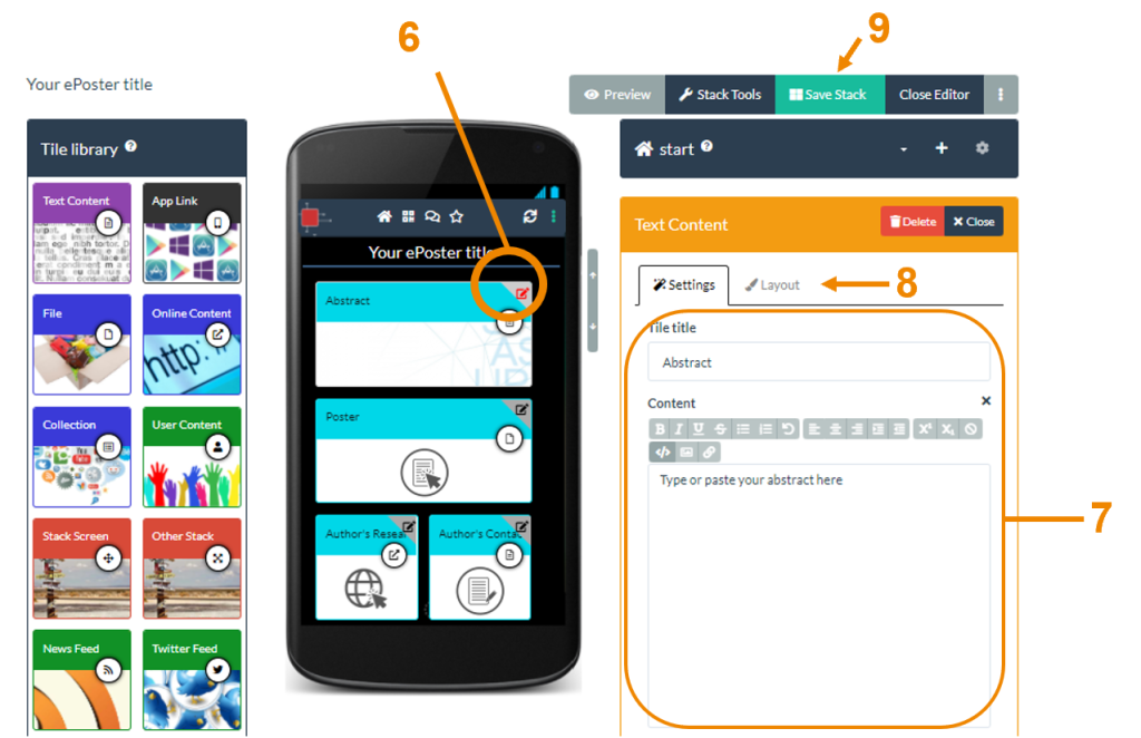 The mobile view with the tiles shows the information your conference is expecting you to include. You should edit each Tile to add the information they have requested. To edit a tile click on the tile edit icon (6) on its top right hand corner. The Settings area (7) will then change to indicate what type of content you can add to this Tile. Add it here in the settings area. You can also change the tile’s appearance (size, title bar colour and background image) in the tile’s Layout tab (8). Remember to save (9) your stack regularly.