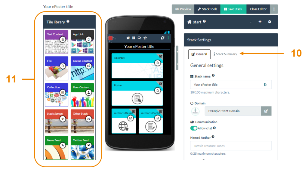 When you have finished editing all the tiles that are in your stack then you should also fill out your stack’s summary information in the Stack Summary tab (10) in the General Settings area. This summary information is used when people search the showcase, so it will help people to find your stack. You can also choose to add more tiles/content to your stack using the Tile Library (11). You simply drag and drop the relevant tile from the library into the mobile view of your stack and then add the required information in the settings area. Again, remember to save your stack before closing the editor or leaving the webpage.